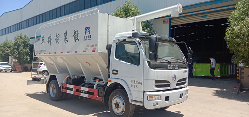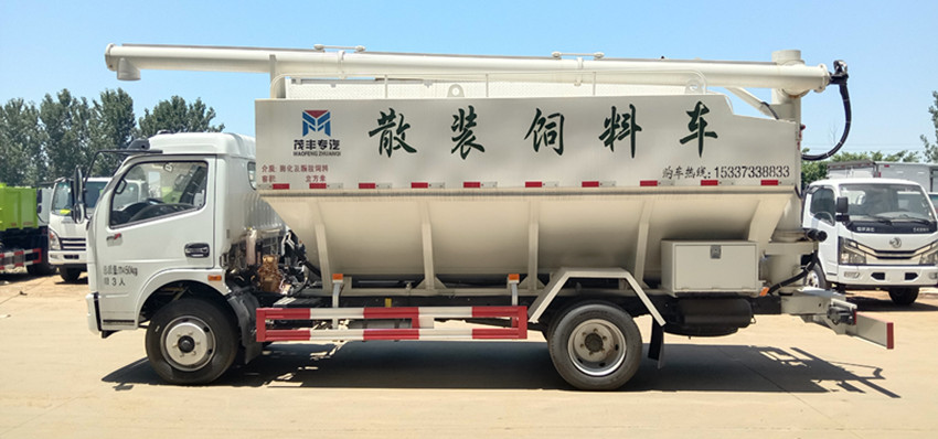散裝飼料運輸車,散裝飼料車的飼料罐架設(shè)在卡車的底盤上,罐頂開有進料口.頂部的一根螺旋輸送卸料管(俗稱卸料絞龍)則可自由回轉(zhuǎn)和抬升,抬升的仰角可達60度。運輸時,頂部的螺旋管平臥在罐頂;卸料時則抬起,使管端的出料口與畜禽飼養(yǎng)場貯料罐頂部的進料門相接,駕駛室內(nèi)裝有操縱裝置(操縱裝置也可裝置在罐體尾部),卸料時通過車底的動力輸出軸和減速器來驅(qū)動螺旋,以完成卸料。