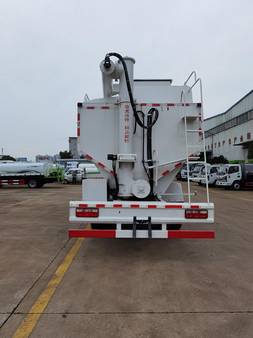 散裝飼料運(yùn)輸車,散裝飼料車的飼料罐架設(shè)在卡車的底盤上,罐頂開有進(jìn)料口.頂部的一根螺旋輸送卸料管(俗稱卸料絞龍)則可自由回轉(zhuǎn)和抬升,抬升的仰角可達(dá)60度。運(yùn)輸時,頂部的螺旋管平臥在罐頂;卸料時則抬起,使管端的出料口與畜禽飼養(yǎng)場貯料罐頂部的進(jìn)料門相接,駕駛室內(nèi)裝有操縱裝置(操縱裝置也可裝置在罐體尾部),卸料時通過車底的動力輸出軸和減速器來驅(qū)動螺旋,以完成卸料。