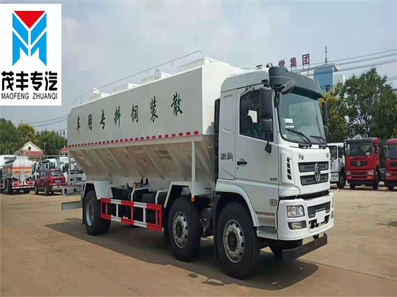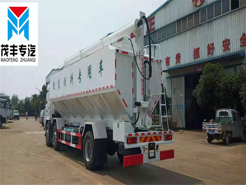 散裝飼料運輸車,散裝飼料車的飼料罐架設(shè)在卡車的底盤上,罐頂開有進(jìn)料口.頂部的一根螺旋輸送卸料管(俗稱卸料絞龍)則可自由回轉(zhuǎn)和抬升,抬升的仰角可達(dá)60度。運輸時,頂部的螺旋管平臥在罐頂;卸料時則抬起,使管端的出料口與畜禽飼養(yǎng)場貯料罐頂部的進(jìn)料門相接,駕駛室內(nèi)裝有操縱裝置(操縱裝置也可裝置在罐體尾部),卸料時通過車底的動力輸出軸和減速器來驅(qū)動螺旋,以完成卸料。