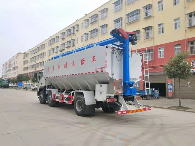 罐體采用4mm碳鋼板制作,罐體內(nèi)分為叁個(gè)倉,(可根據(jù)用戶需求做多個(gè)分倉)可****各分倉卸料順序和速度,整車3條蛟龍(底部水平絞龍、尾部垂直絞龍、頂部卸料絞龍),由取力器經(jīng)車輛變速箱取力后,將動(dòng)力傳動(dòng)**高壓油泵以驅(qū)動(dòng)液壓系統(tǒng)帶動(dòng)各絞龍工作,或者由3個(gè)5.5kw 380v電機(jī)帶動(dòng)各絞龍工作,頂部絞龍液壓**舉升,可左右旋轉(zhuǎn)180°此車公告+環(huán)保+燃油齊全,全國上戶無憂! 散裝飼料運(yùn)輸車,散裝飼料車的飼料罐架設(shè)在卡車的底盤上,罐頂開有進(jìn)料口.頂部的一根螺旋輸送卸料管(俗稱卸料絞龍)則可自由回轉(zhuǎn)和抬升,抬升的仰角可達(dá)60度。運(yùn)輸時(shí),頂部的螺旋管平臥在罐頂;卸料時(shí)則抬起,使管端的出料口與畜禽飼養(yǎng)場貯料罐頂部的進(jìn)料門相接,駕駛室內(nèi)裝有操縱裝置(操縱裝置也可裝置在罐體尾部),卸料時(shí)通過車底的動(dòng)力輸出軸和減速器來驅(qū)動(dòng)螺旋,以完成卸料。