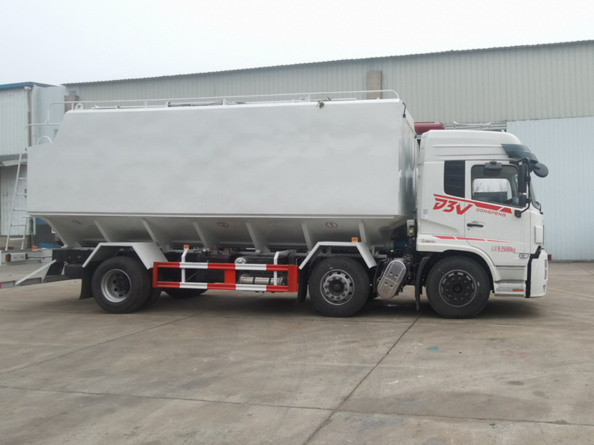 散裝飼料運(yùn)輸車,散裝飼料車的飼料罐架設(shè)在卡車的底盤上,罐頂開有進(jìn)料口.頂部的一根螺旋輸送卸料管(俗稱卸料絞龍)則可自由回轉(zhuǎn)和抬升,抬升的仰角可達(dá)60度。運(yùn)輸時(shí),頂部的螺旋管平臥在罐頂;卸料時(shí)則抬起,使管端的出料口與畜禽飼養(yǎng)場(chǎng)貯料罐頂部的進(jìn)料門相接,駕駛室內(nèi)裝有操縱裝置(操縱裝置也可裝置在罐體尾部),卸料時(shí)通過車底的動(dòng)力輸出軸和減速器來驅(qū)動(dòng)螺旋,以完成卸料。