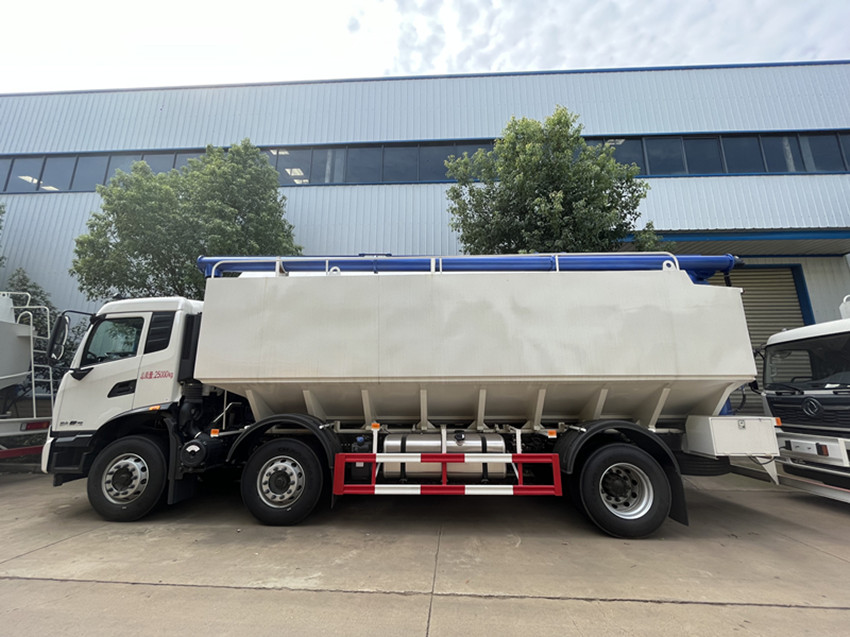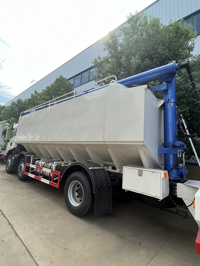 散裝飼料運(yùn)輸車,散裝飼料車的飼料罐架設(shè)在卡車的底盤上,罐頂開有進(jìn)料口.頂部的一根螺旋輸送卸料管(俗稱卸料絞龍)則可自由回轉(zhuǎn)和抬升,抬升的仰角可達(dá)60度。運(yùn)輸時(shí),頂部的螺旋管平臥在罐頂;卸料時(shí)則抬起,使管端的出料口與畜禽飼養(yǎng)場(chǎng)貯料罐頂部的進(jìn)料門相接,駕駛室內(nèi)裝有操縱裝置(操縱裝置也可裝置在罐體尾部),卸料時(shí)通過車底的動(dòng)力輸出軸和減速器來驅(qū)動(dòng)螺旋,以完成卸料。