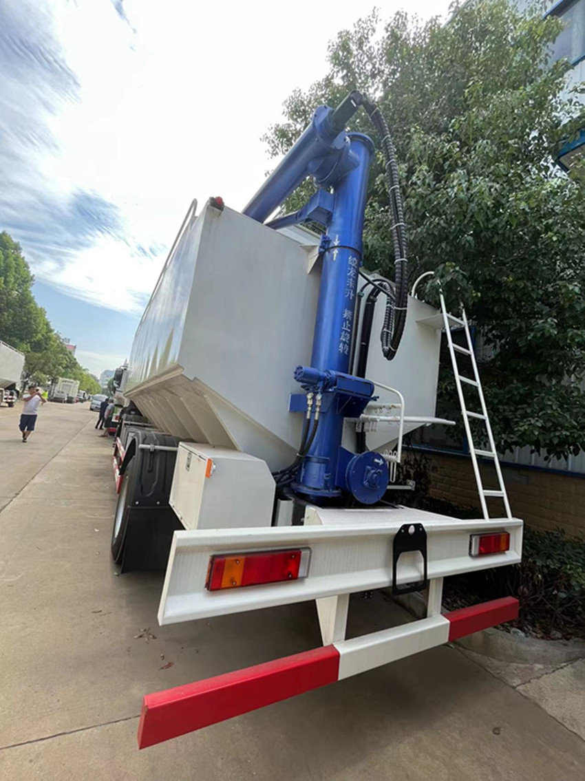 散裝飼料運(yùn)輸車,散裝飼料車的飼料罐架設(shè)在卡車的底盤上,罐頂開有進(jìn)料口.頂部的一根螺旋輸送卸料管(俗稱卸料絞龍)則可自由回轉(zhuǎn)和抬升,抬升的仰角可達(dá)60度。運(yùn)輸時(shí),頂部的螺旋管平臥在罐頂;卸料時(shí)則抬起,使管端的出料口與畜禽飼養(yǎng)場貯料罐頂部的進(jìn)料門相接,駕駛室內(nèi)裝有操縱裝置(操縱裝置也可裝置在罐體尾部),卸料時(shí)通過車底的動力輸出軸和減速器來驅(qū)動螺旋,以完成卸料。