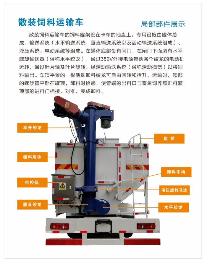 上裝配置:罐體采用4mm優(yōu)質(zhì)鈦鋼板制作,罐體分為叁個(gè)倉(cāng)(可根據(jù)用戶需求做多個(gè)分倉(cāng)),可以各分倉(cāng)卸料順序和速度,整車3條絞龍(底部水平絞龍、尾部垂直絞龍、頂部舉升絞龍),由3個(gè)5.5kw 380v電機(jī)帶動(dòng)各絞龍工作,頂部絞龍液壓舉升,可左右旋轉(zhuǎn)180° 此車公告+環(huán)保+燃油齊全,全國(guó)上戶無(wú)憂!