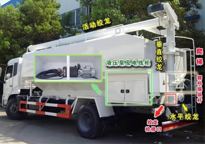 上裝配置:罐體采用4mm優(yōu)質(zhì)鈦鋼板制作,罐體分為肆個(gè)倉(可根據(jù)用戶需求做多個(gè)分倉),可以各分倉卸料順序和速度,整車3條絞龍(底部水平絞龍、尾部垂直絞龍、頂部舉升絞龍),由3個(gè)5.5kw 380v電機(jī)帶動(dòng)各絞龍工作,頂部絞龍液壓舉升,可左右旋轉(zhuǎn)180°