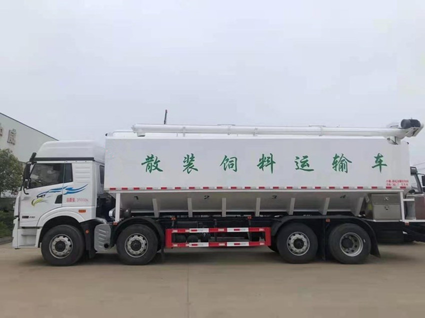 散裝飼料運(yùn)輸車,散裝飼料車的飼料罐架設(shè)在卡車的底盤上,罐頂開有進(jìn)料口.頂部的一根螺旋輸送卸料管(俗稱卸料絞龍)則可自由回轉(zhuǎn)和抬升,抬升的仰角可達(dá)60度。運(yùn)輸時(shí),頂部的螺旋管平臥在罐頂;卸料時(shí)則抬起,使管端的出料口與畜禽飼養(yǎng)場貯料罐頂部的進(jìn)料門相接,駕駛室內(nèi)裝有操縱裝置(操縱裝置也可裝置在罐體尾部),卸料時(shí)通過車底的動(dòng)力輸出軸和減速器來驅(qū)動(dòng)螺旋,以完成卸料。