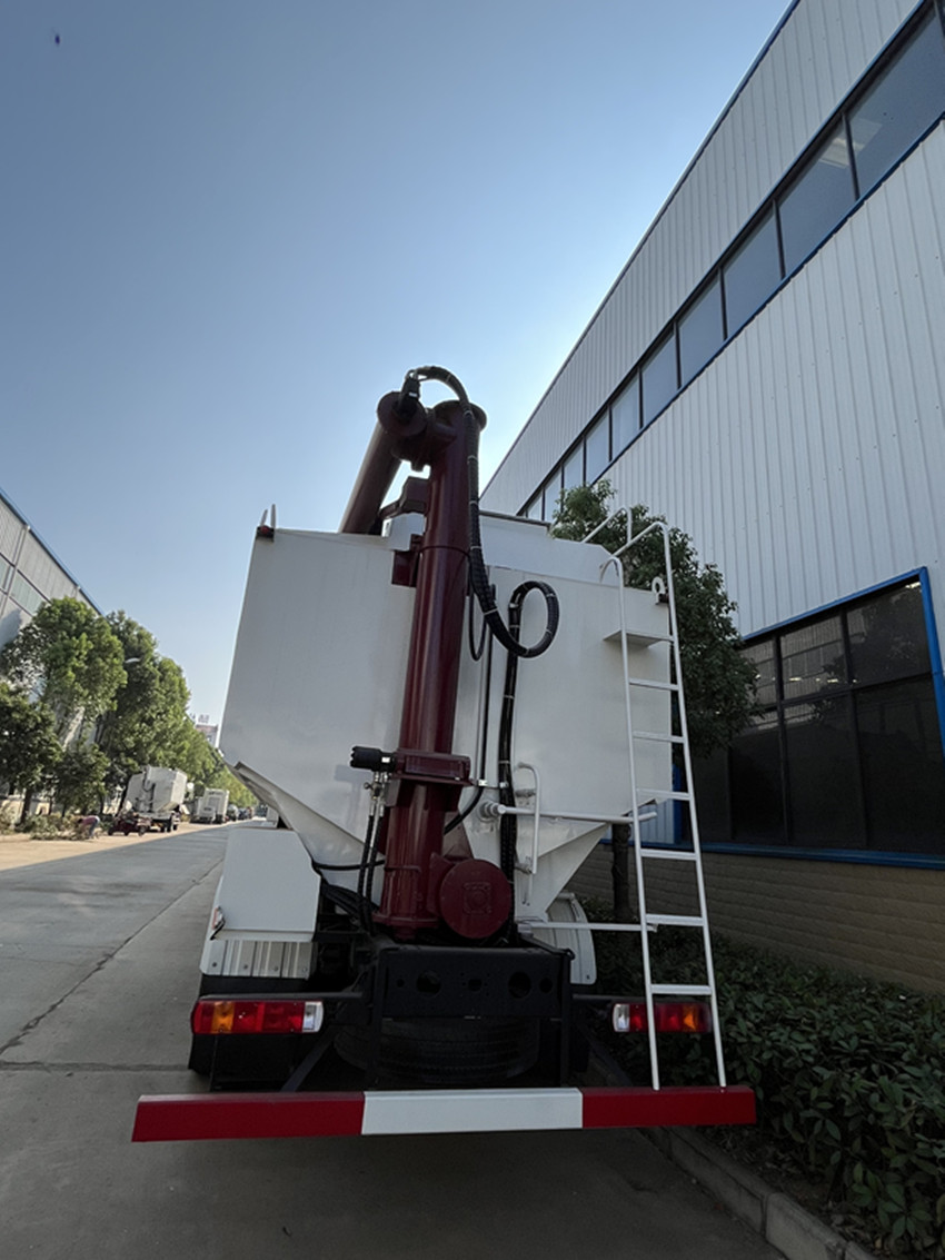 散裝飼料運(yùn)輸車,散裝飼料車的飼料罐架設(shè)在卡車的底盤上,罐頂開有進(jìn)料口.頂部的一根螺旋輸送卸料管(俗稱卸料絞龍)則可自由回轉(zhuǎn)和抬升,抬升的仰角可達(dá)60度。運(yùn)輸時,頂部的螺旋管平臥在罐頂;卸料時則抬起,使管端的出料口與畜禽飼養(yǎng)場貯料罐頂部的進(jìn)料門相接,駕駛室內(nèi)裝有操縱裝置(操縱裝置也可裝置在罐體尾部),卸料時通過車底的動力輸出軸和減速器來驅(qū)動螺旋,以完成卸料。