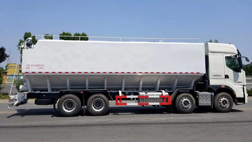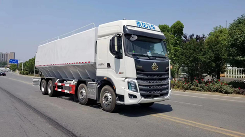 散裝飼料運輸車,散裝飼料車的飼料罐架設(shè)在卡車的底盤上,罐頂開有進料口.頂部的一根螺旋輸送卸料管(俗稱卸料絞龍)則可自由回轉(zhuǎn)和抬升,抬升的仰角可達60度。運輸時,頂部的螺旋管平臥在罐頂;卸料時則抬起,使管端的出料口與畜禽飼養(yǎng)場貯料罐頂部的進料門相接,駕駛室內(nèi)裝有操縱裝置(操縱裝置也可裝置在罐體尾部),卸料時通過車底的動力輸出軸和減速器來驅(qū)動螺旋,以完成卸料。