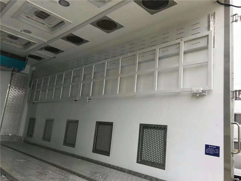 7.恒溫系統(tǒng):由車載制冷機,暖風機,氣體混合輸送倉,排風扇等組成,實現(xiàn)仔豬生存空間氣體的流通和恒溫.為保證運輸過程中對溫度的,畜禽運輸車采用雙系統(tǒng)制冷空調(diào),且箱體兩側(cè)設(shè)計三排帶電動排